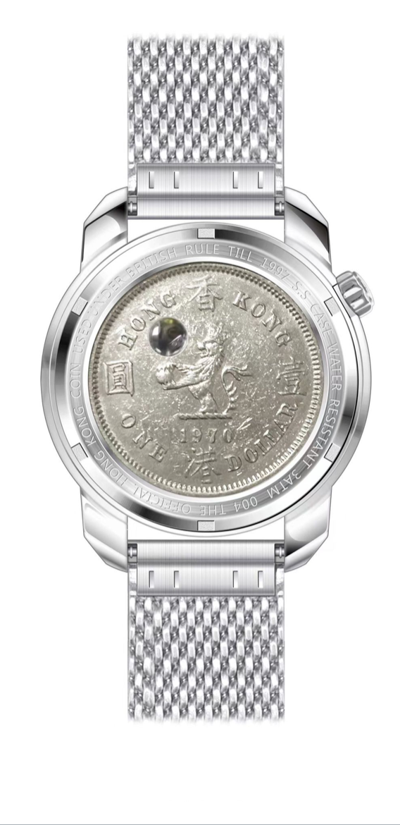 This watch is made with the 1970s British-Hong Kong colonial coin. It shows a crowned and draped bust of the Queen facing right with QUEEN ELIZABETH THE SECOND. On the reverse side, at the center is the heraldic crest of the Colony, the upper part of a crowned lion rampant holding a globe; “1970” etched below the lion, and “HONG KONG ONE DOLLAR” etched around the edge divided by four Chinese characters.